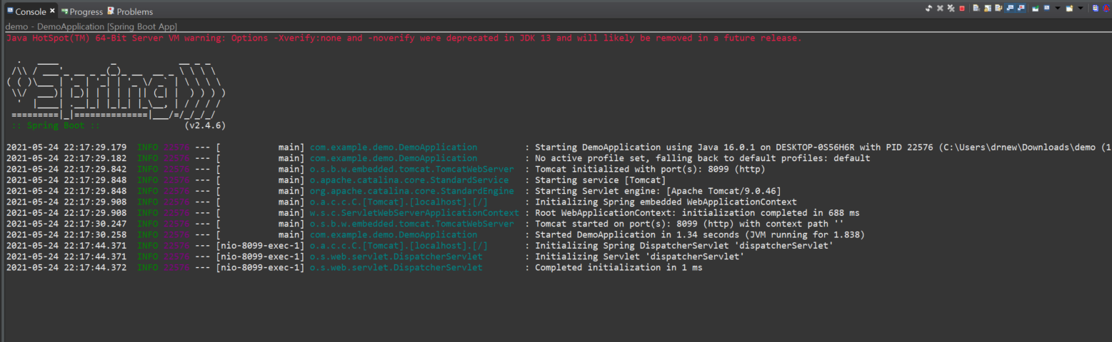 DemoApplciation.java에 가서 ctrl + F11를 눌러 Spring Boot App으로 실행시켜보자.