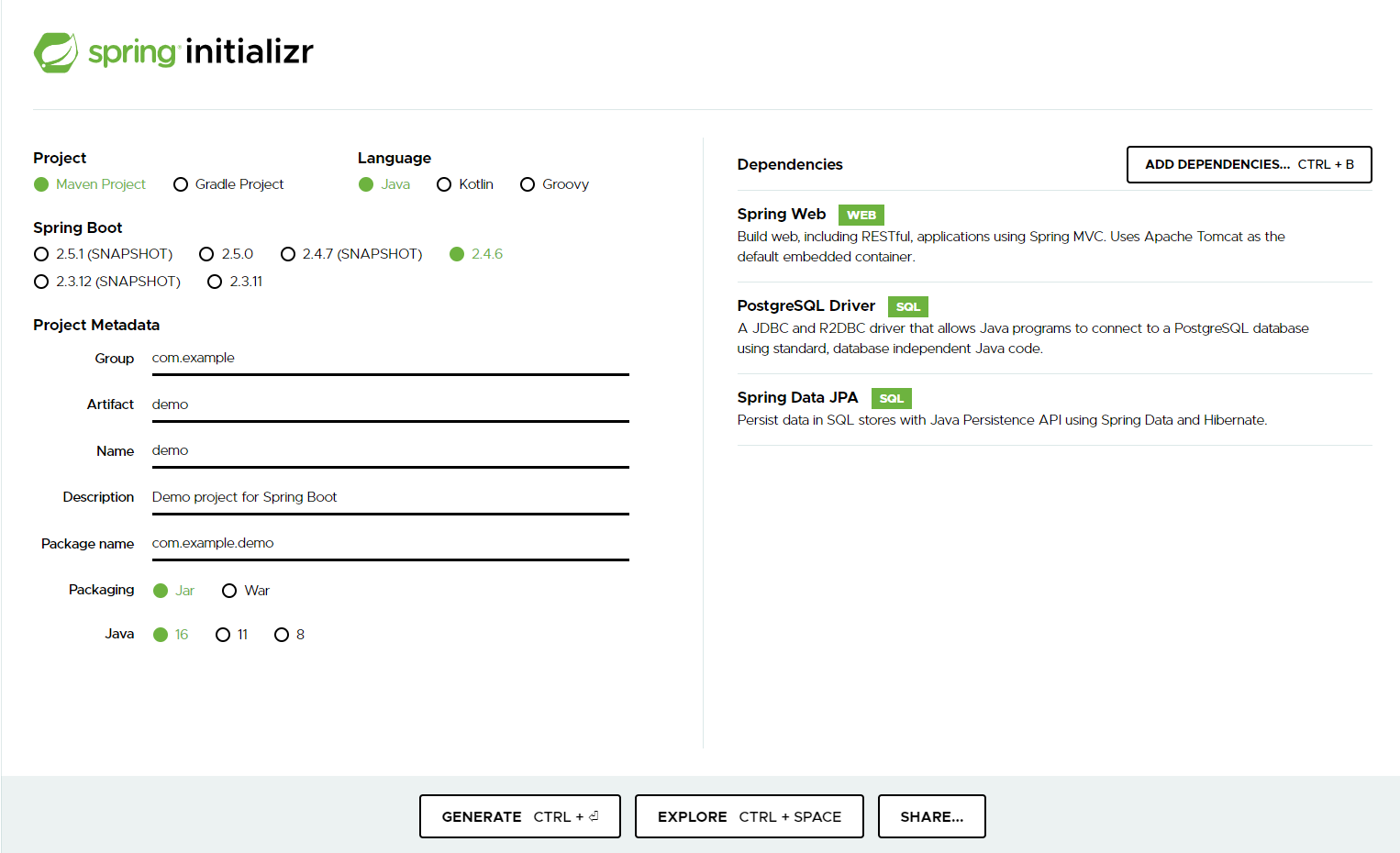 Spring Web / PostgreSQL Driver / JPA 의존성을 주입시켰다.